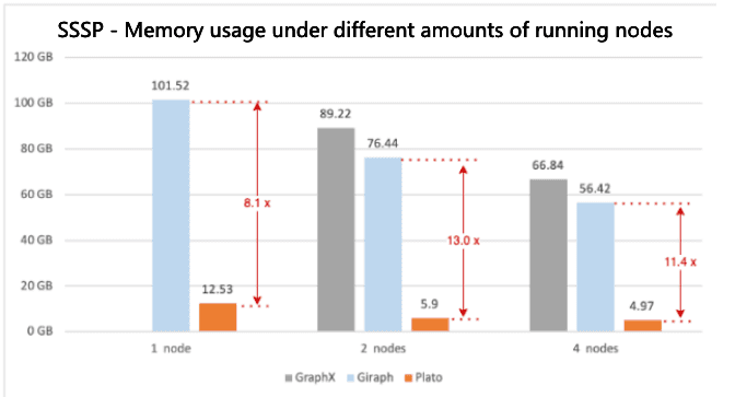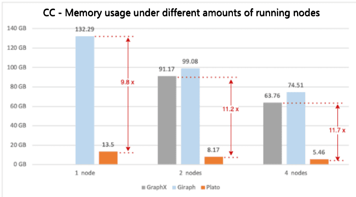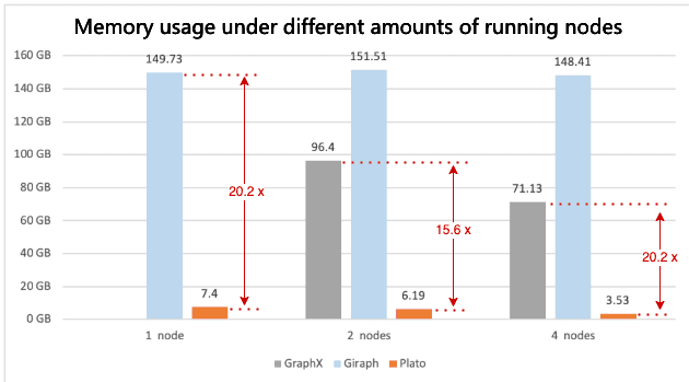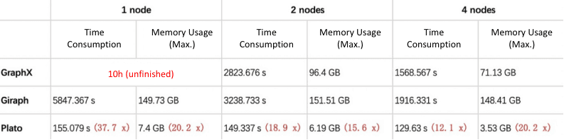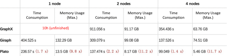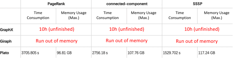 Plato: Because of the excellent design of the communication model and the sophisticated implementation of the storage structure (see Section 3.1.2), Plato can run these algorithms in a four-node deployment mode with a maximum execution time of fewer than 70 minutes, even with very large datasets, and the memory usage of a single machine is far from the memory limit (192 GB).