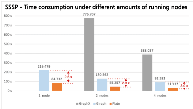 Figure 5. SSSP benchmarking results of time consumption with different numbers of running nodes