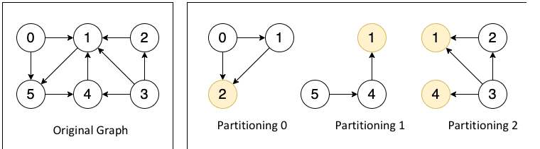 Figure 7 shows the cut for the Pull communication mode, where one vertex and its incoming and outgoing edges are divided into one partition. Due to the vertex being partitioned, the vertex may be stored multiple times, i.e. a vertex may have multiple mirror vertices (yellow circles in the figure), but only 1 master vertex (white circle). The data of the vertex is stored on the master vertex, and the mirror vertices act as a "bridge" for message passing.
