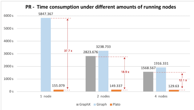 18.9 x: Represents the runtime ratio of Plato to the better performance one in the other two frameworks in 2 nodes mode (2823.676 / 149.337 = 18.9). That is, in this scenario, Plato performs at least 18.9 times better than the other two frameworks. The same for the other metrics.
