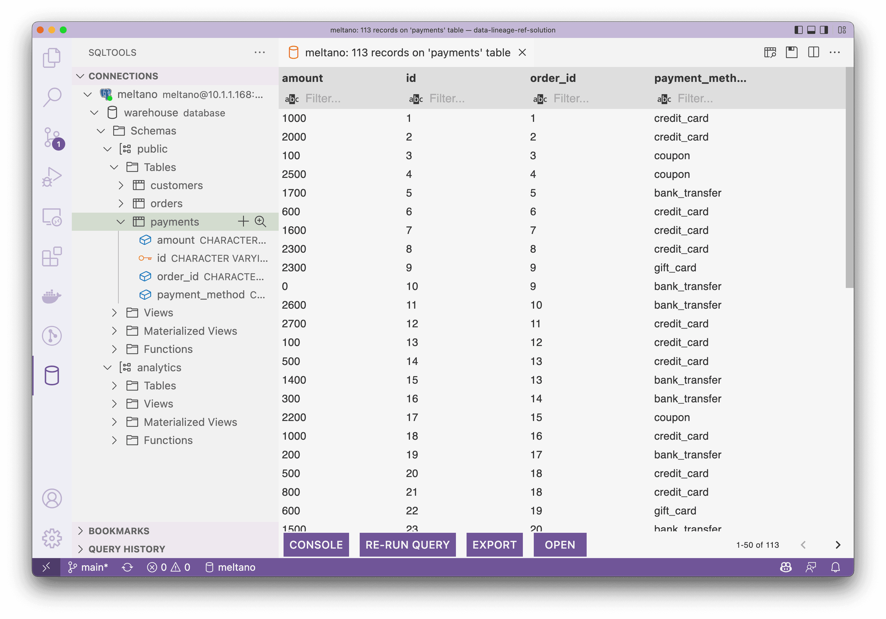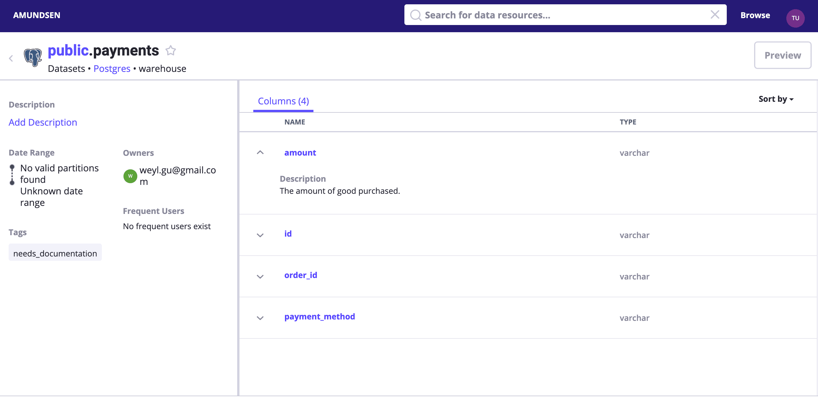 Search payments or directly visit http://localhost:5000/table_detail/warehouse/postgres/public/payments, you could see the metadata from our Postgres like: