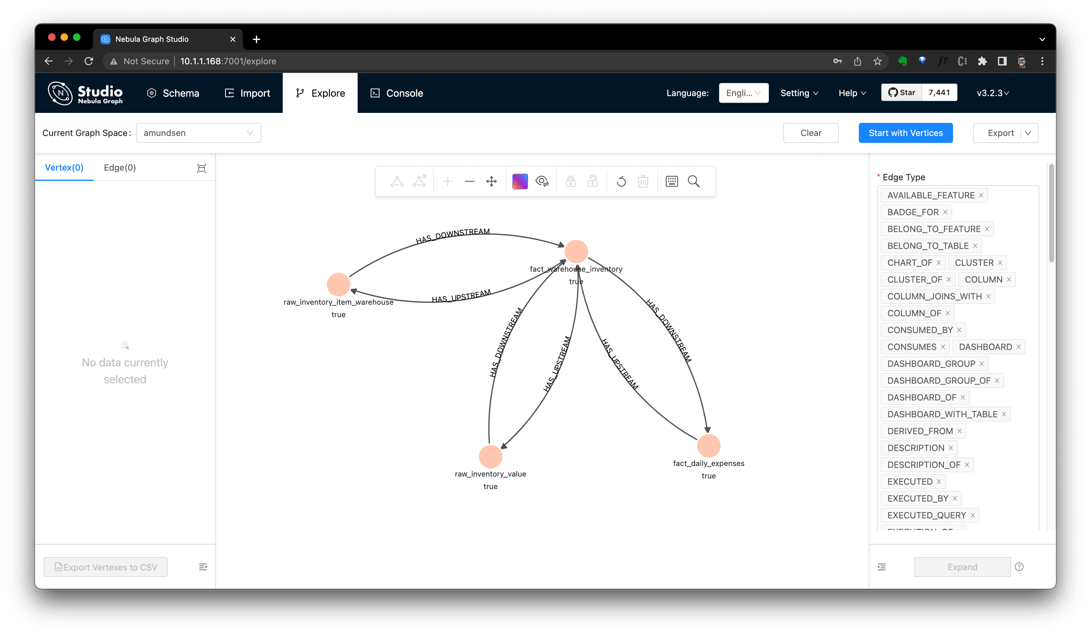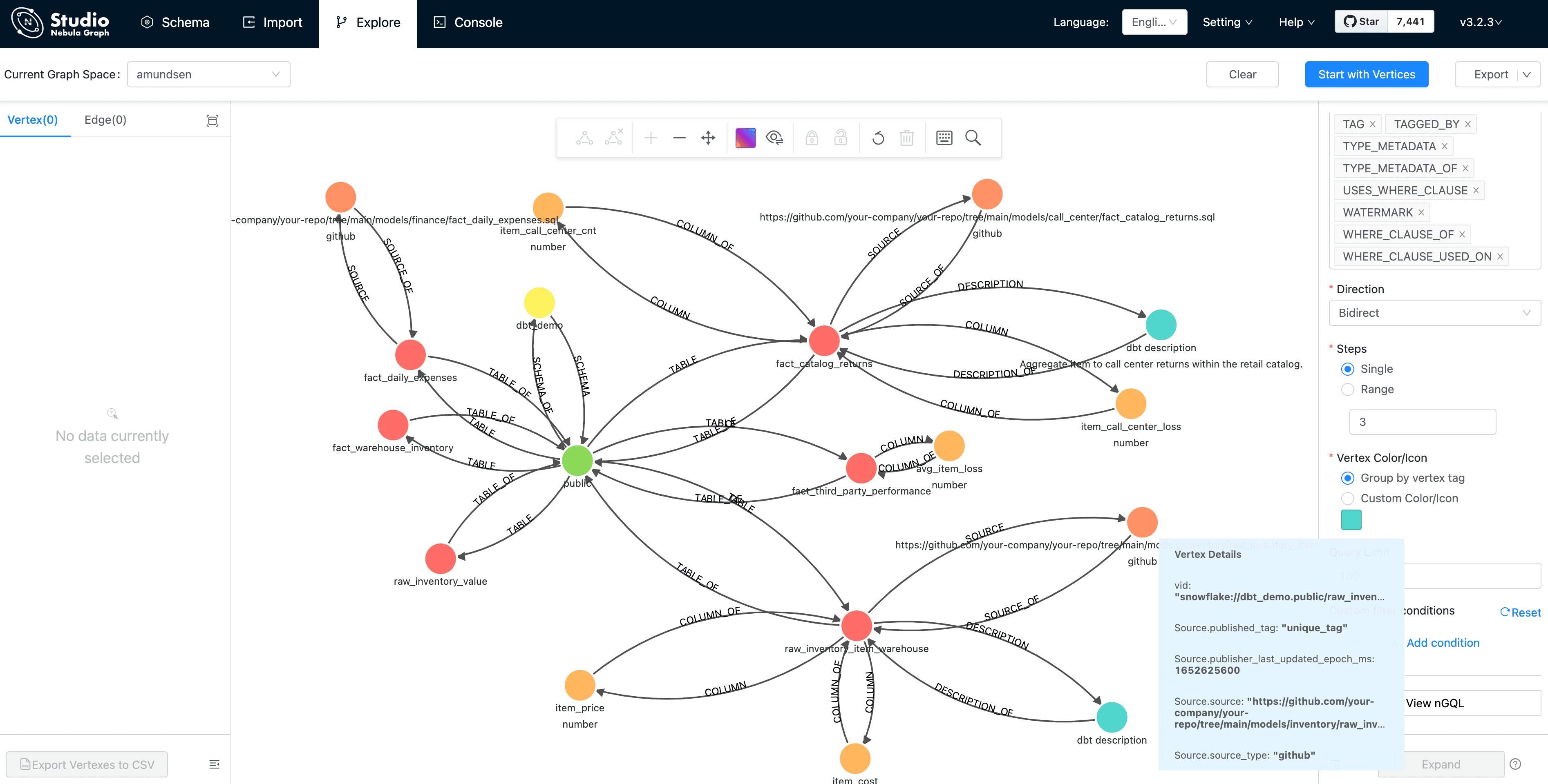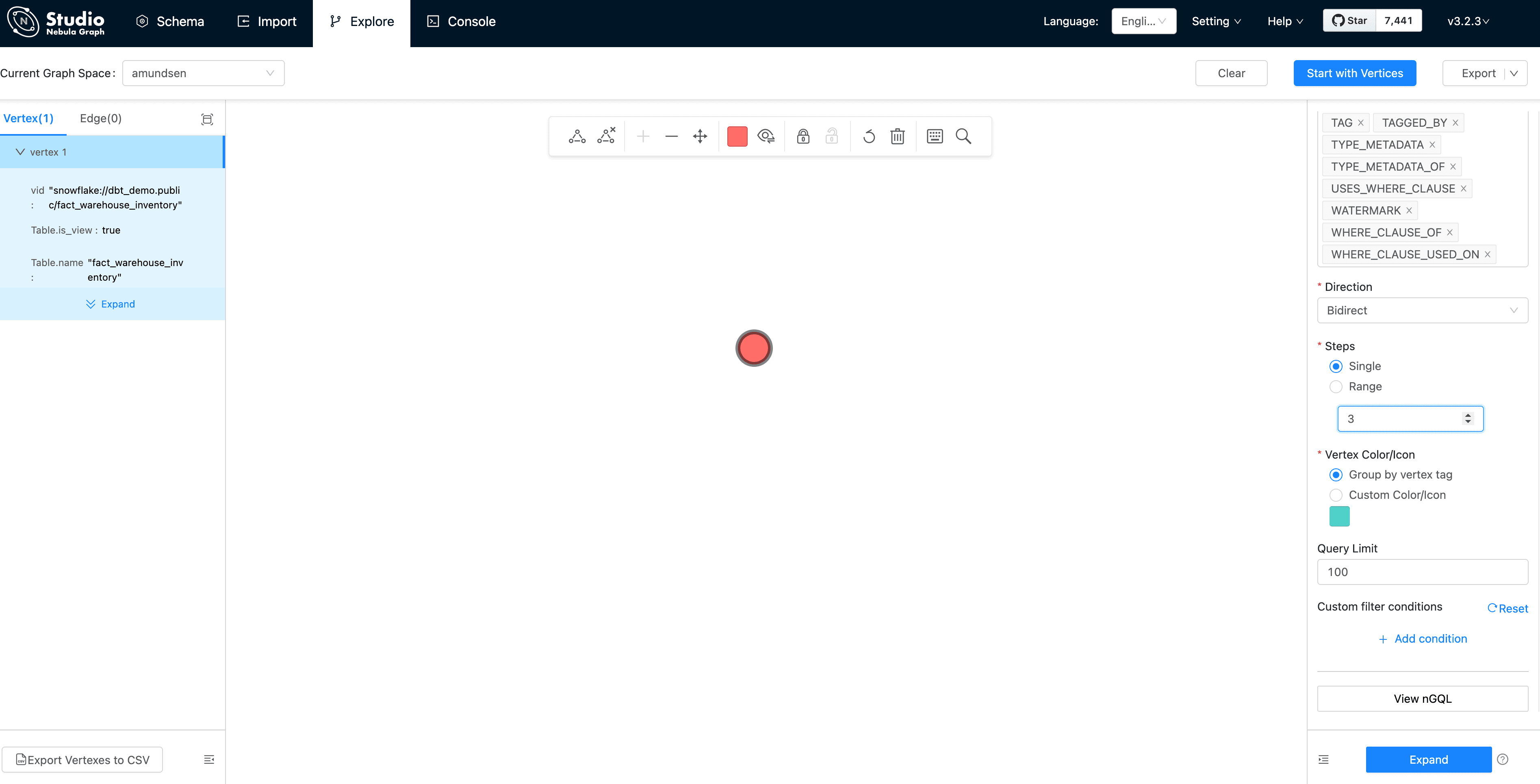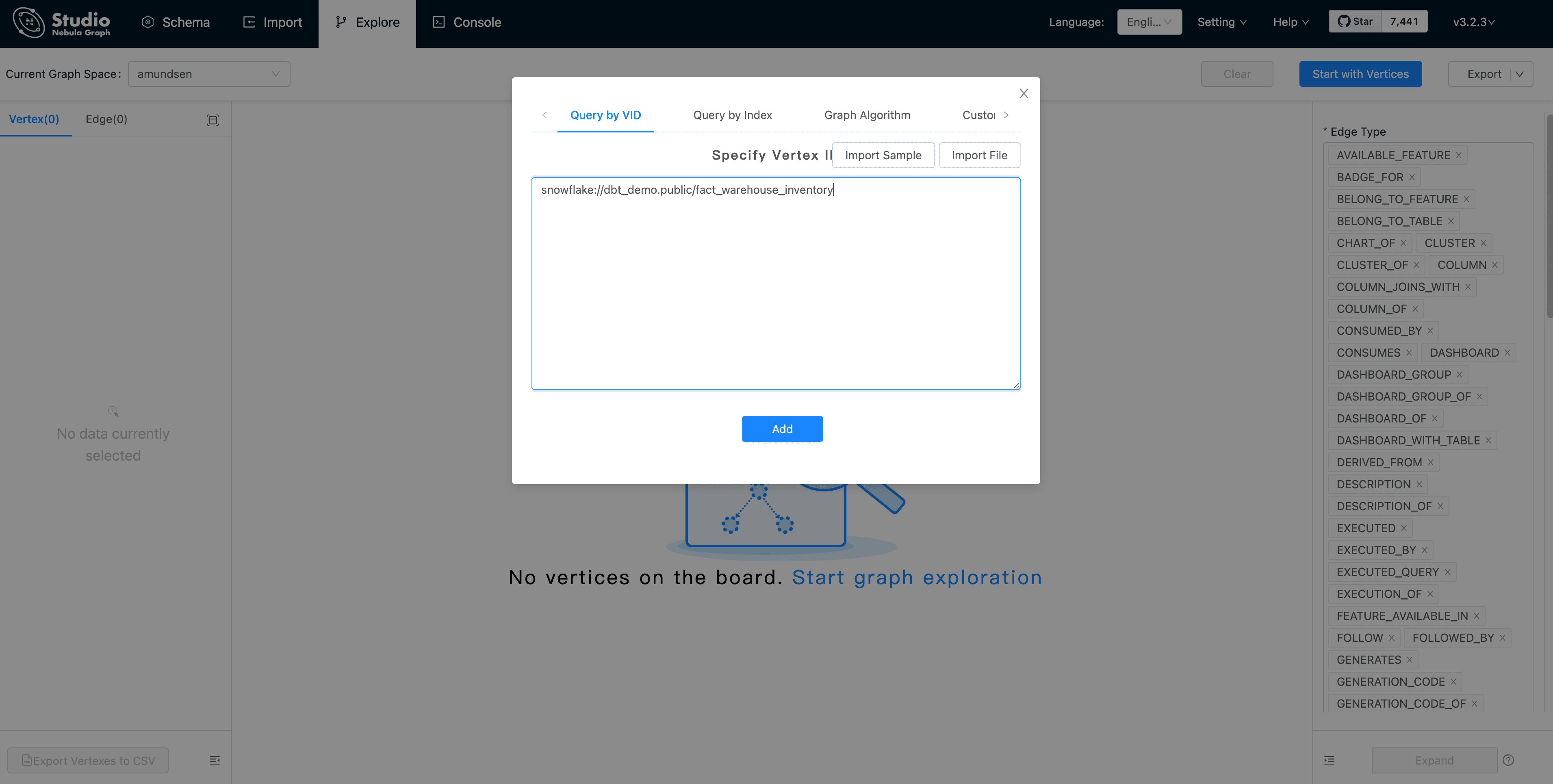 First, click "Start with Vertices", fill in the vertex id: snowflake://dbt_demo.public/fact_warehouse_inventory