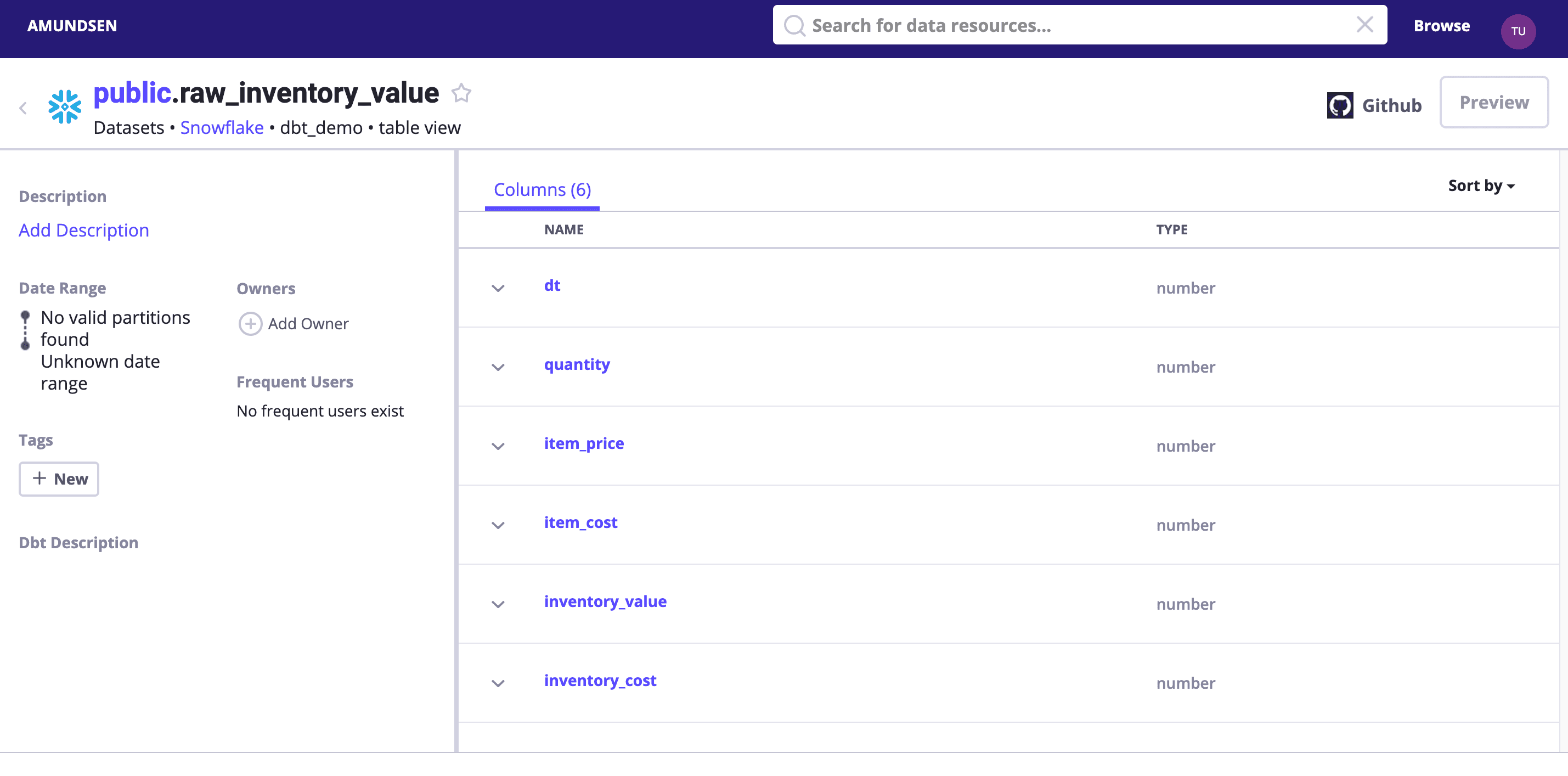 Search dbt_demo or visit http://localhost:5000/table_detail/dbt_demo/snowflake/public/raw_inventory_value to see: