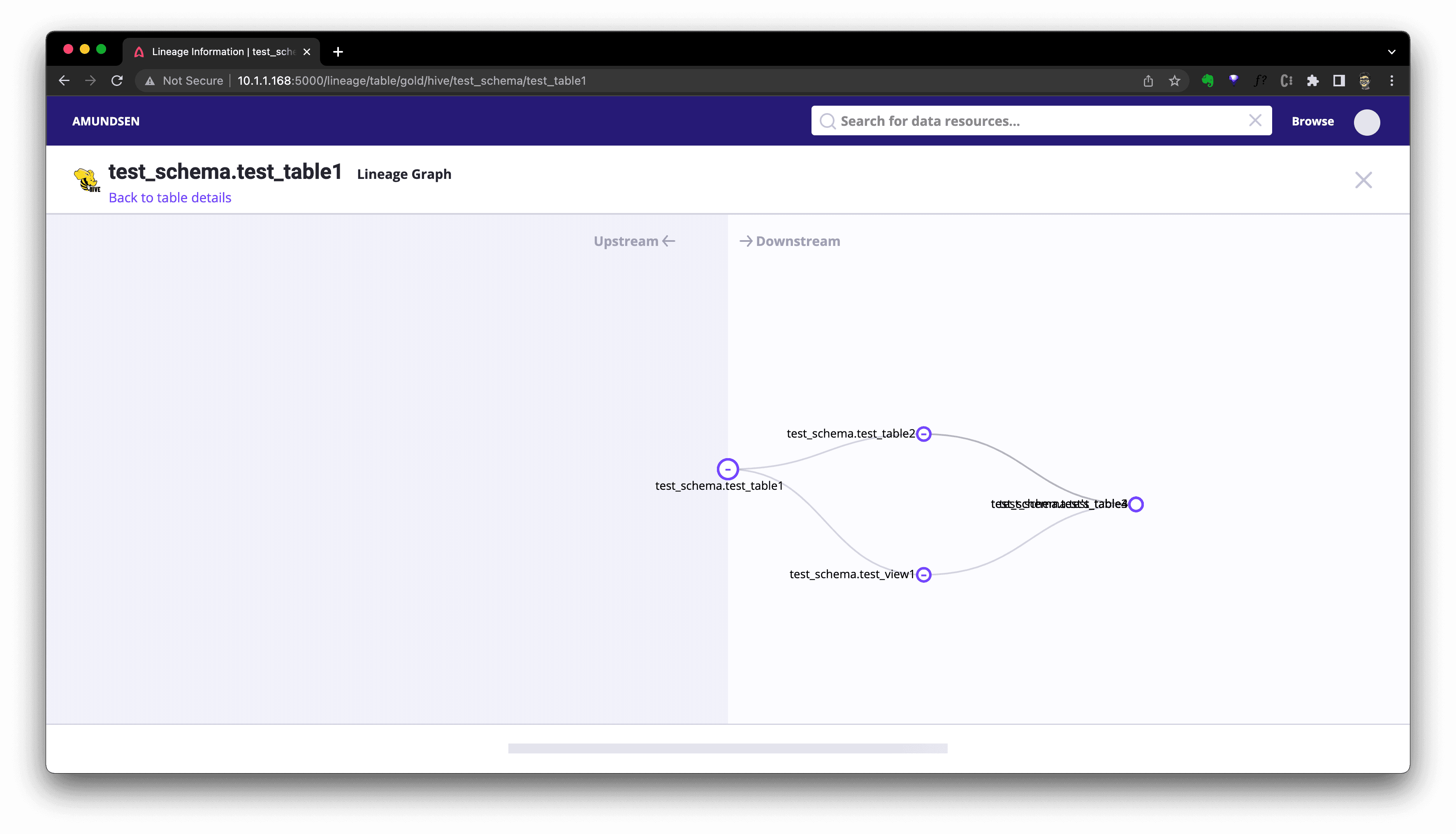 After that, we could visit http://localhost:5000/lineage/table/gold/hive/test_schema/test_table1 to see the Lineage is shown as: