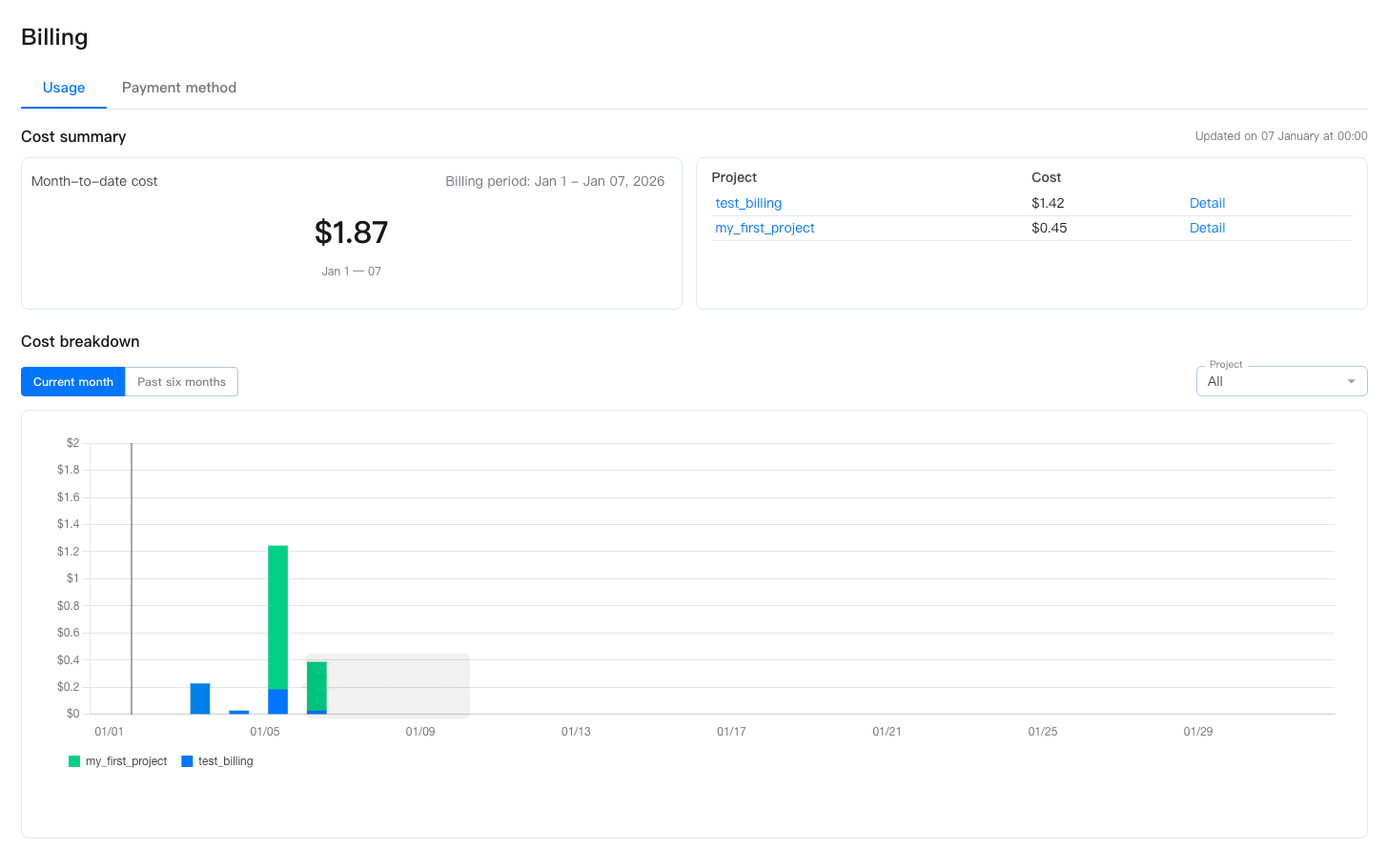 After the payment method is added successfully, you can view the usage details on the Usage tab.