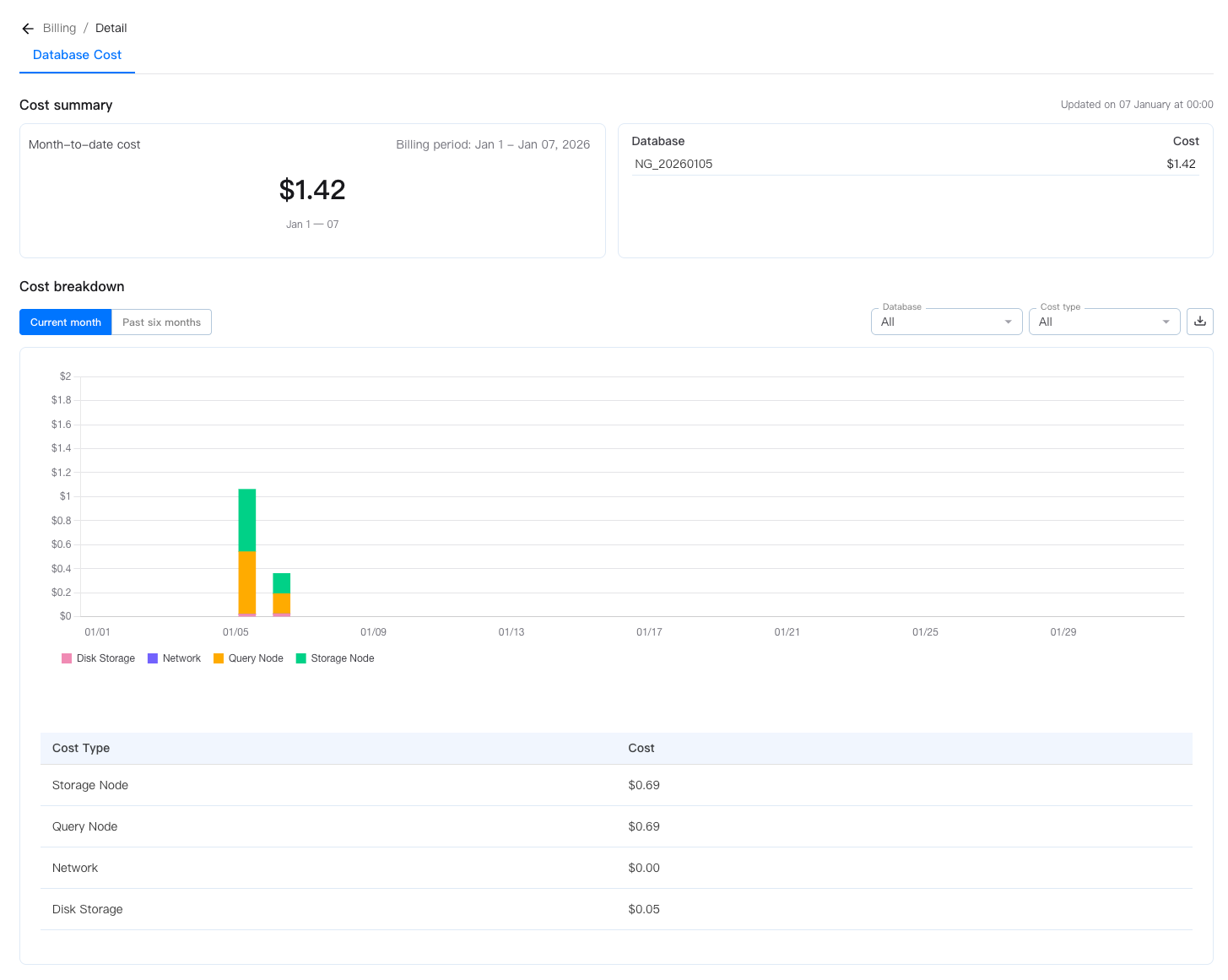- Cost breakdown: Displays the cost trends in the current month and in the past 6 months. The costs are broken down by cost type and can be filtered by database instance and cost type.