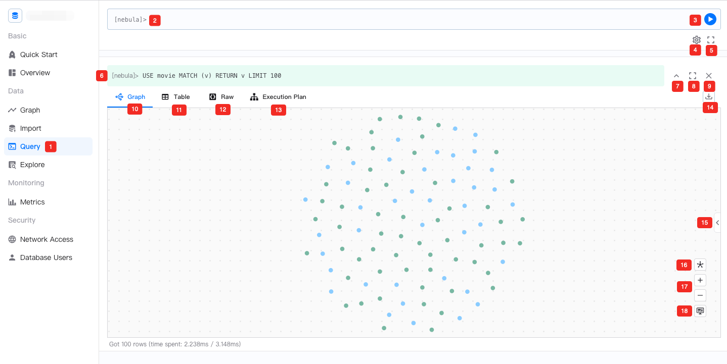 | 3 | Run button | Execute the GQL query in the input area. You can also press Shift + Enter to execute the query. |